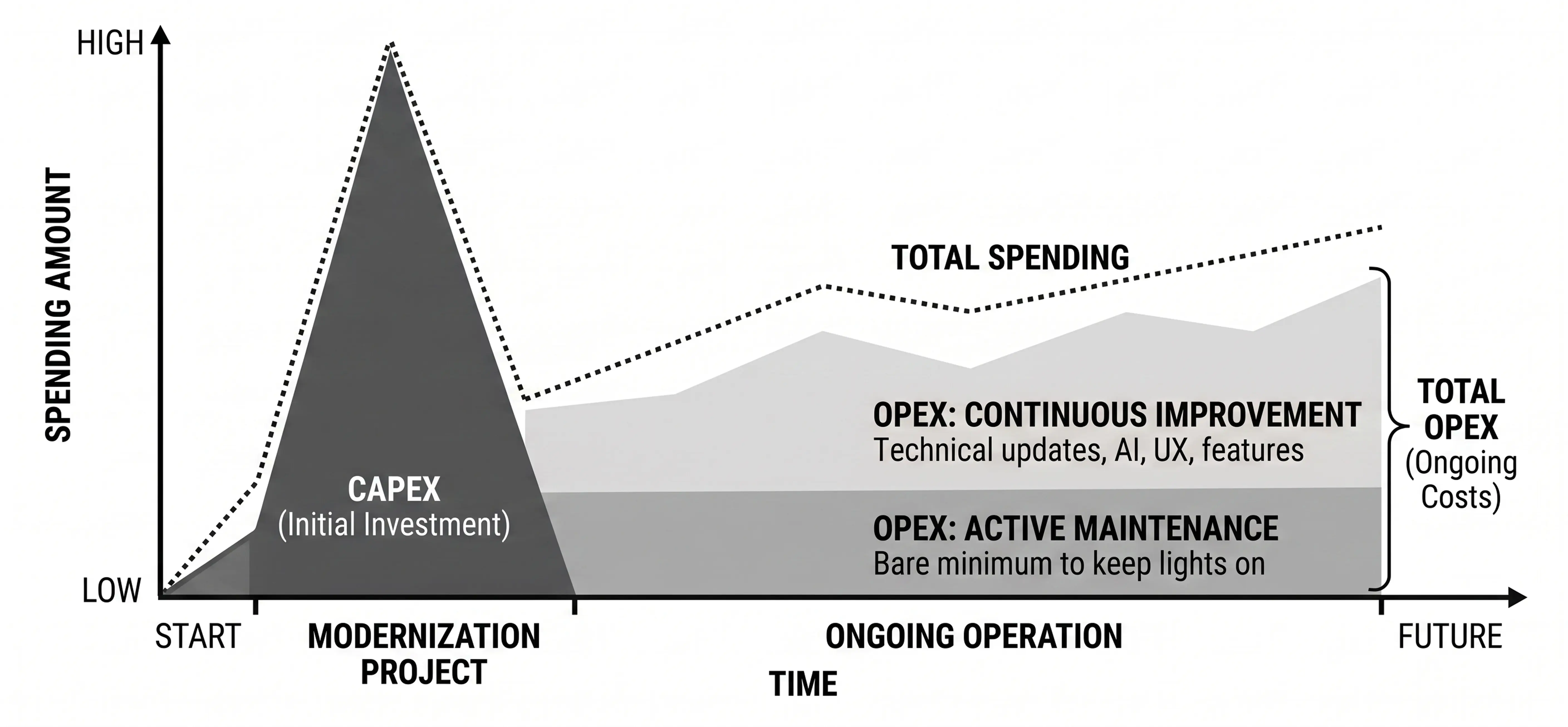 Beyond keeping the lights on, most applications, and the companies that run them, require a second tier of OPEX investment focused on continuous improvement. A modernized product must remain dynamic to stay competitive. This ongoing investment fuels important technical advancements like AI integration, elevates the overall user experience, and allows for the seamless rollout of new features that meet evolving market demands.